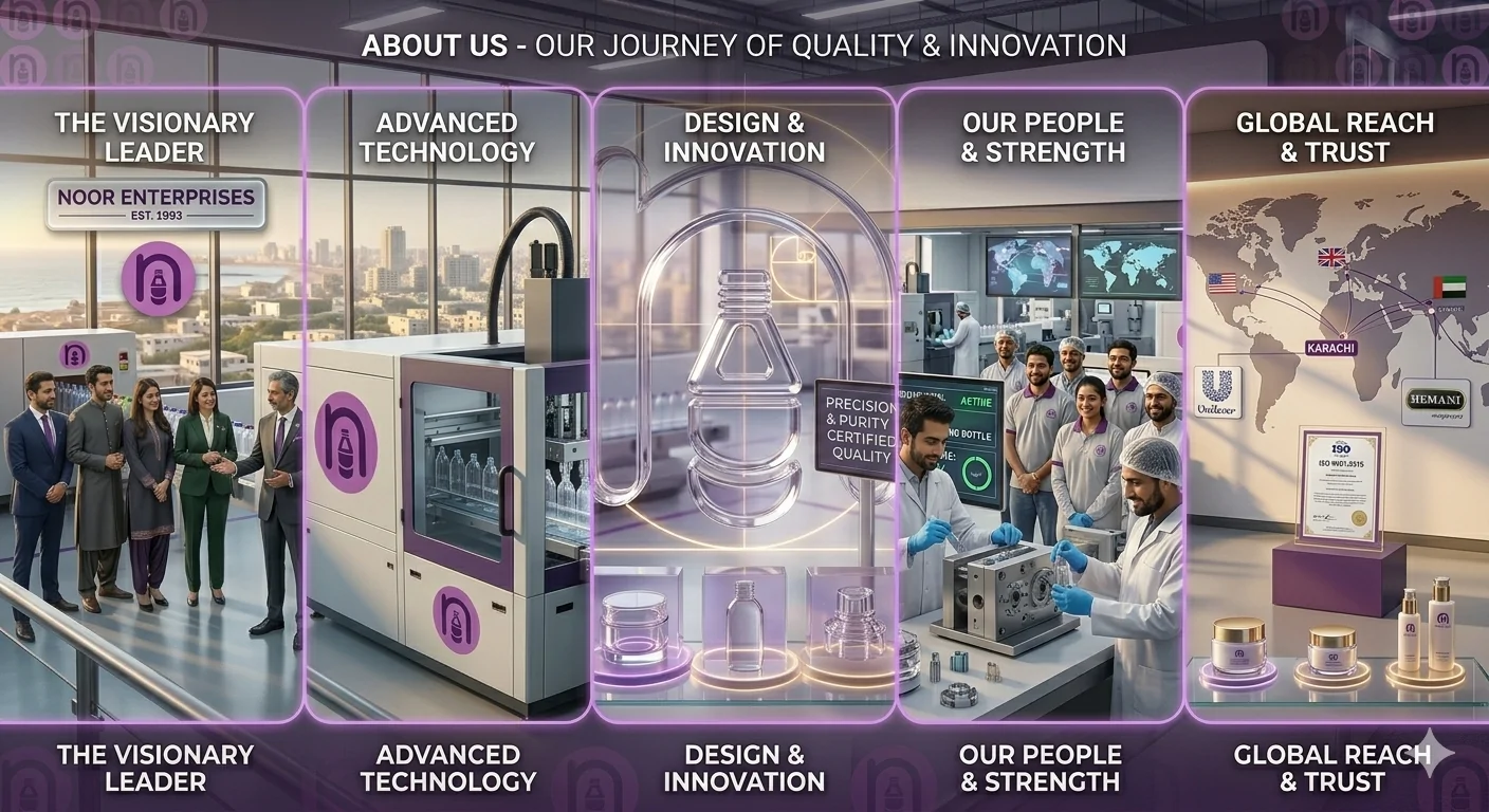 Founded in 1993, Noor Enterprises has evolved from a specialized manufacturing unit into a global leader in plastic packaging. Based in Karachi, we combine art and engineering to create packaging that doesn’t just hold your product—it defines your brand. Our commitment to precision ensures that every bottle, jar, and closure meets international standards of excellence.